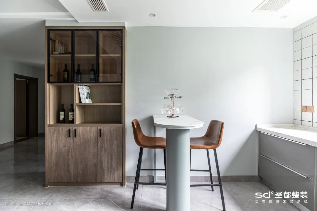 在餐边柜增加水槽区和开关插座,不仅方便餐前餐后洗手,还能随时煮咖啡、豆浆,进一步提高家居舒适度。