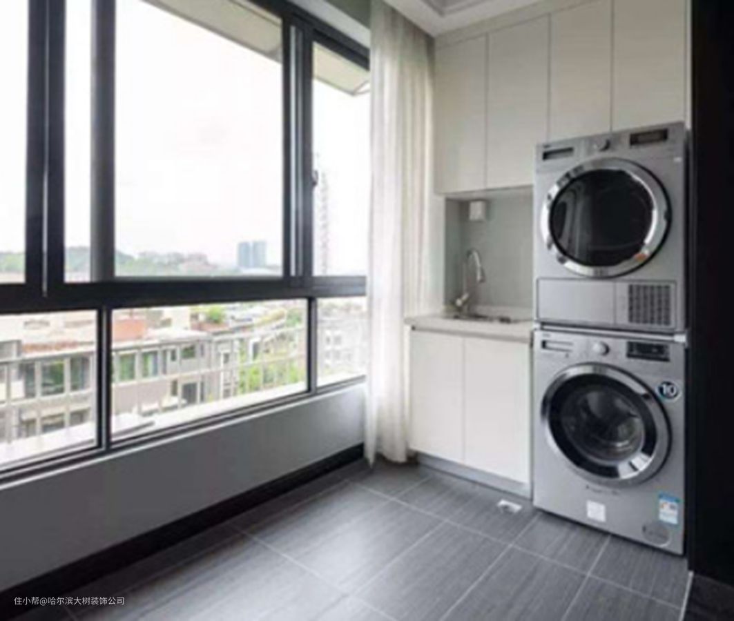 1、洗衣房设计:将洗衣房放置在阳台,形成一个小小的家务区,方便衣物洗涤和清洁的晾晒,同时节约一大部分卫生间的空间。