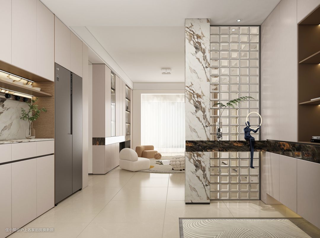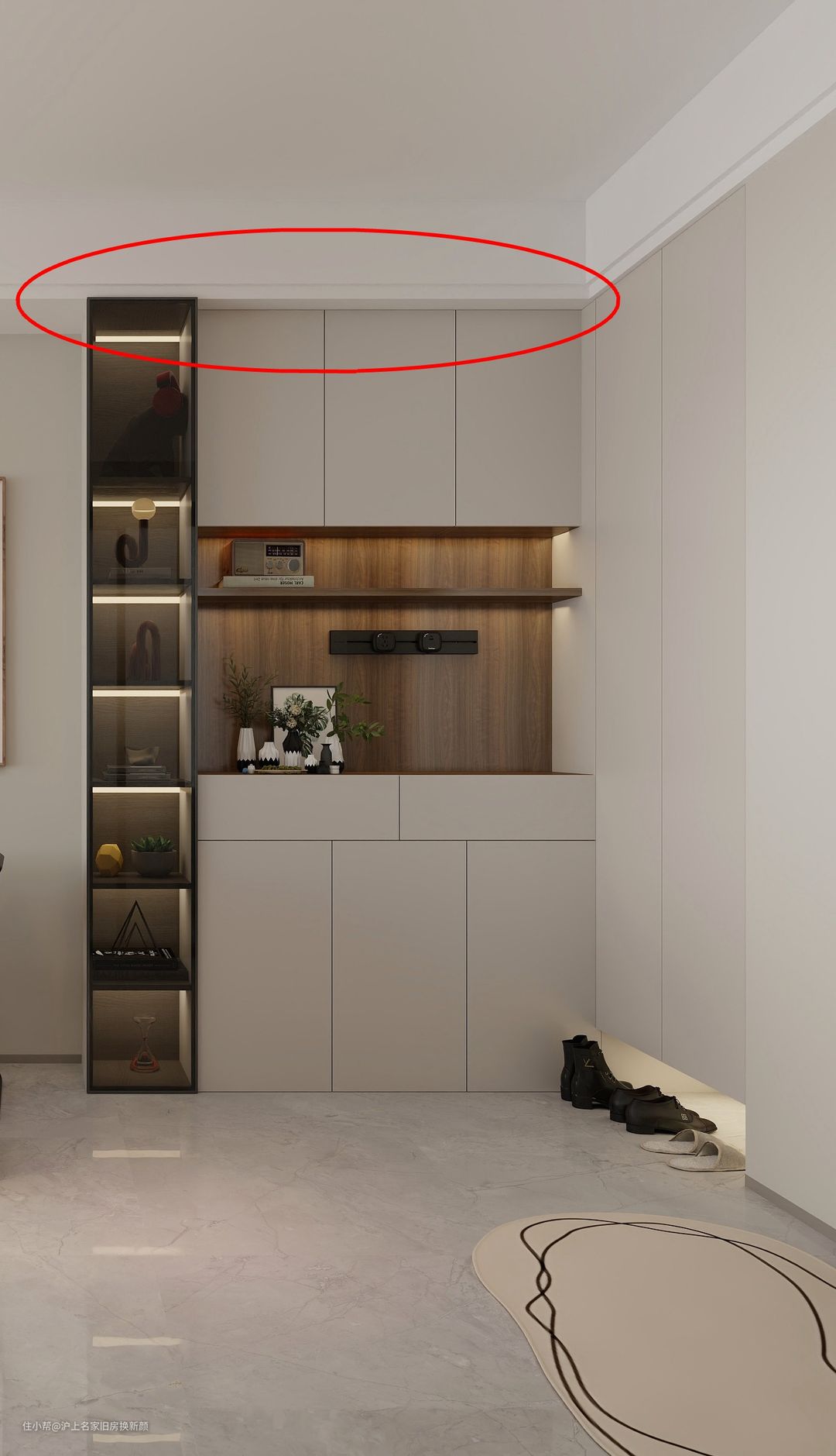 有时候为了不让空间显得太压迫,设计师不会将柜体做到顶,而会保留一些空隙,营造视觉通透感,但留的这个缝隙就会成为卫生死角,平常飘落的灰尘都会堆积在这!