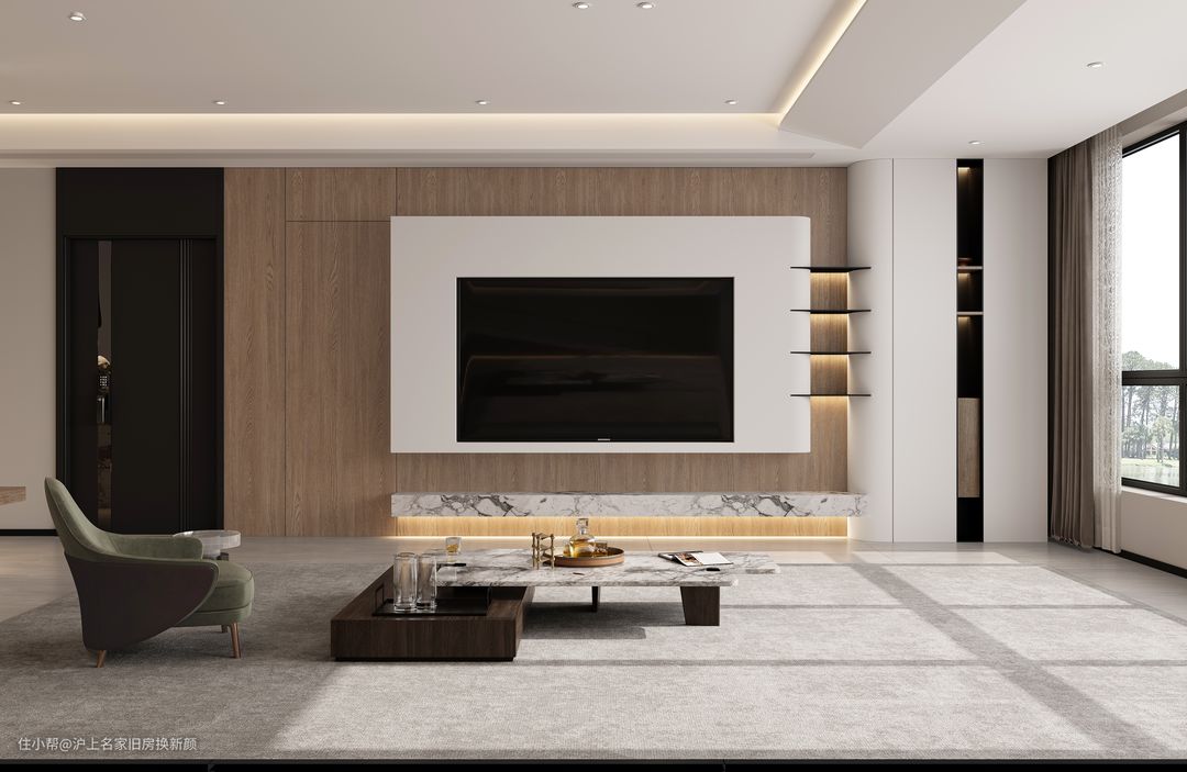电视背景墙与下方的悬空收纳柜结合,一是增加收纳,二是保持视觉空间感的平衡,悬浮的设计不会显得空间呆板压抑,相反很有设计感,空间反而高级轻盈。
