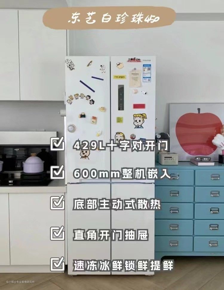如果你想要个白色系+超薄零嵌式+自动制冰冰箱,东芝白珍珠450无疑是最好的选择,主打“小体积、大容量”,完全精准适配小厨房,对于挑剔症、强迫症非常友好。