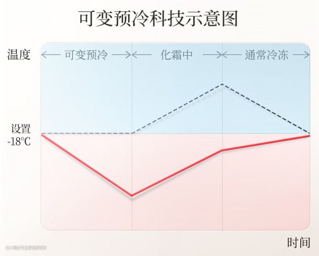- 无霜冷冻技术:可变预冷科技,即使冰箱除霜使温度上升,冷冻室同样维持在-18℃以下,生鲜食材久冻不结霜,鱼虾肉蟹久冻如鲜。