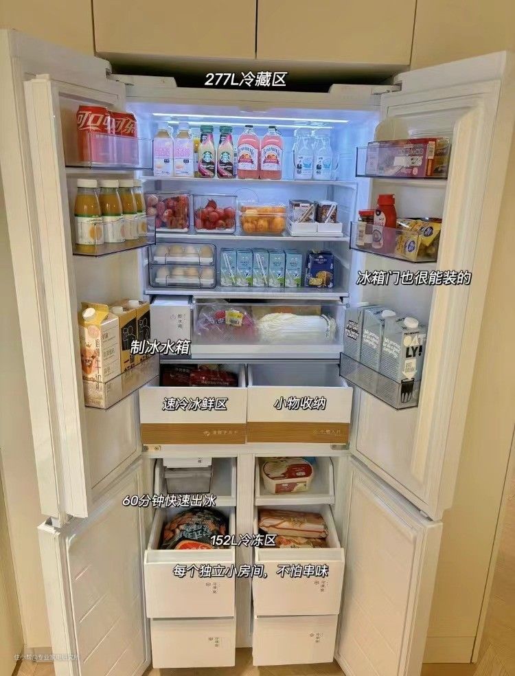 它的容量也超级大,520升超市级囤鲜大容量,搭配19格精细分区,让每一个食材都能找到适合自己的位置,各种瓶瓶罐罐也不再杂乱,一次囤放全家两周的食材照样整洁不拥挤,非常适合喜欢囤货的朋友。