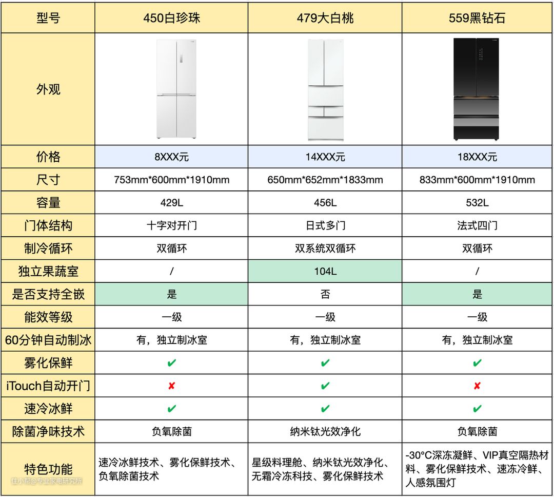 450白珍珠、479大白桃、559黑钻石三款冰箱的尺寸、外观、售价、功能、容量在上面表格中都一目了然,大家根据自己预算和实际需求选择即可,如果想要了解详细的功能配置和使用感受,请接着往下看。
