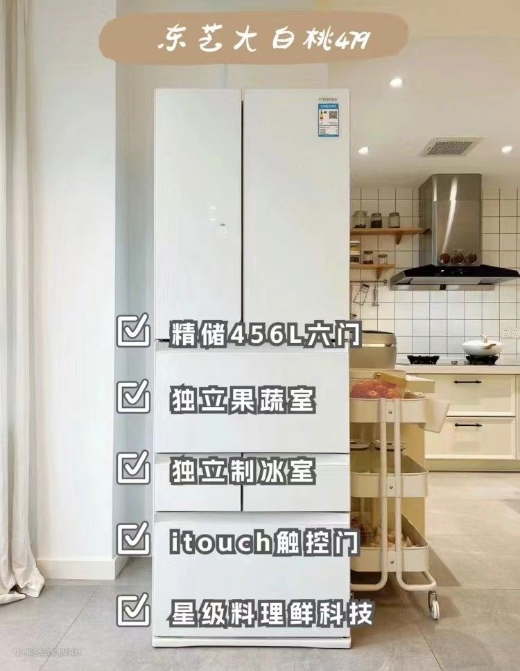 除了东芝450,另外一款就是网红款东芝479大白桃。东芝大白桃外观看上去小巧可爱,但实际容量却足足有456L,而且六门设计合理分区,让食材有序摆放,方便取用。