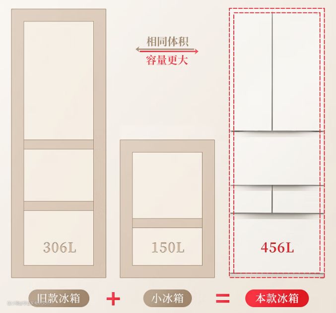 东芝大白桃的外观设计灵感来源于日本富士雪山,白色肤感面板简单却不显单调,无论摆放在哪里都好看;采用东芝特有的真空保温技术,减少隔板发泡层厚度,同等体积下容量更大,实现真正的“皮薄馅大”;占地不到半平米,456L的大容量一家三口完全够用。