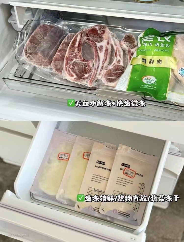 特有的肉食星级料理舱,有快速微冻和原味解冻模式,最大限度保持肉类鲜度,解冻后的牛排口感依旧鲜嫩多汁,不会干柴难吃。还有三种速冻锁鲜模式可选,而且支持热物直放,夏天想立刻喝上刚出锅的绿豆汤,就可以很快品尝到;在家也可以自制果蔬冻干,干净又健康。