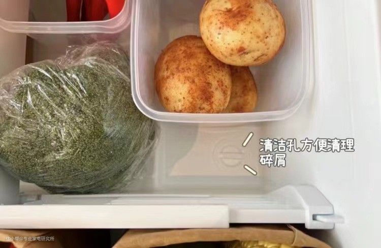 大家在储存果蔬的时候,不可避免地会把蔬菜碎叶和泥土带进冰箱,东芝大白桃为了解决这个痛点,在果蔬室设计了一个便捷清扫口,不需要取出抽屉,只需要将菜叶和泥土等脏污清理到清扫口就可以啦。