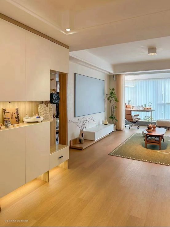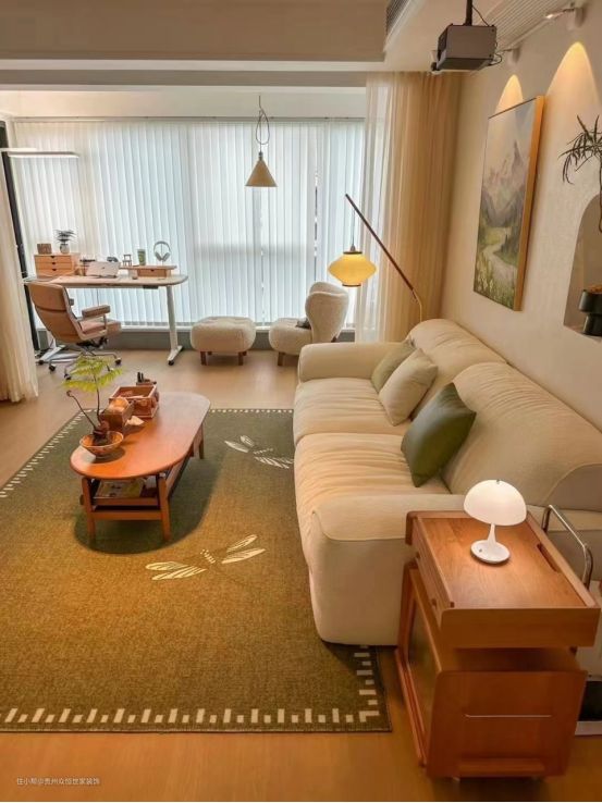 客厅地面首选木地板,配合上射灯的灯光会浪漫温馨,除此之外,木纹砖、柔光砖也非常适合奶油原木,一定不能用灰色或者亮光砖,直接一秒破坏掉原木风。客厅简洁舒适,沙发选择奶白色+绿色地毯,让空间充满生机感。