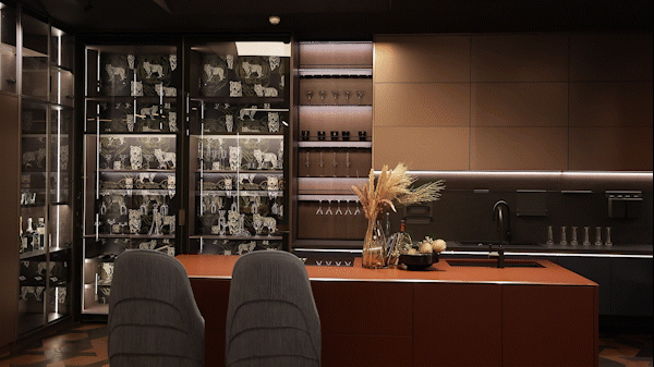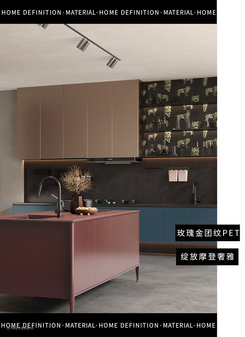 当阳光透过窗户洒落在竹鎏金PET门墙,光影绰绰为空间蒙上一层诗意,浸润出东方美学生活的雅致;传统底蕴与现代金属碰撞,银丝纹PET铺设出更为个性的厨房空间表达,映出当代东方的格调与颠覆传统的艺术体验。