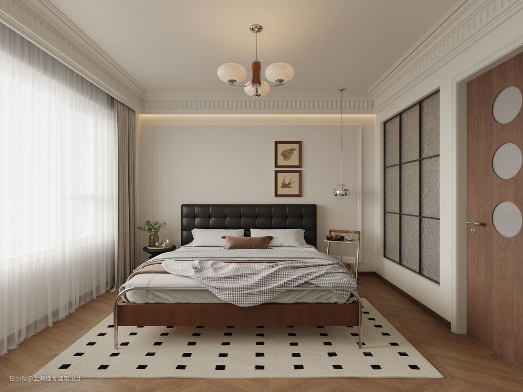 二楼为业主的私人领地,包含了:更衣间、卫浴间、洗衣间、化妆区一应俱全~✌🏻主卧床特意选择了黑色复古风浓郁的床铺,吊顶四周不做复杂设计,设计了钢琴线🎹样式,看上去清新又带有特色🍃