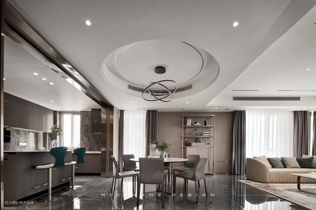 本案业主喜欢有质感、硬朗的设计风格,因此设计师以冷灰咖色作为主色调,搭配岩板、真皮、金属元素打造轻奢感。整体空间自由疏朗,家居也遵循简约质感的原则,并以深浅适应的木饰面融入各空间,空间在和谐统一的基础上又具视觉层次感。色彩与设计结合,以利落笔调刻画艺术和趣味并存的生活空间,为业主建构了一方安静舒适而高级的私人天地。
