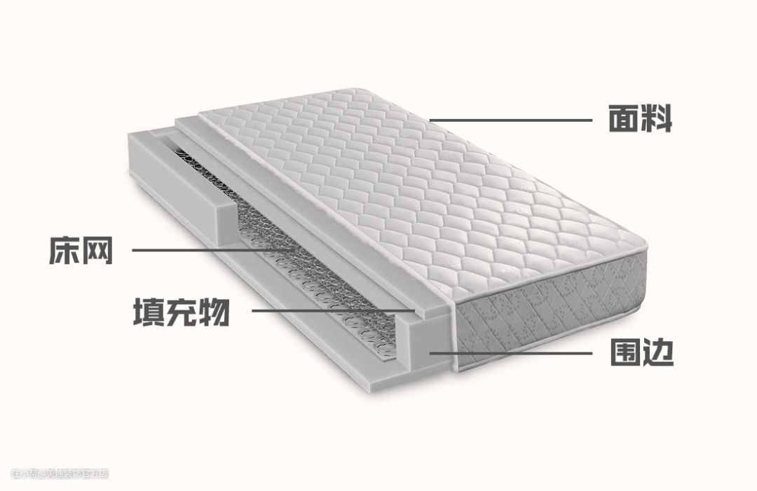 大部分床垫内部总共分为四个部分,分别是:床网、填充物、面料、围边。