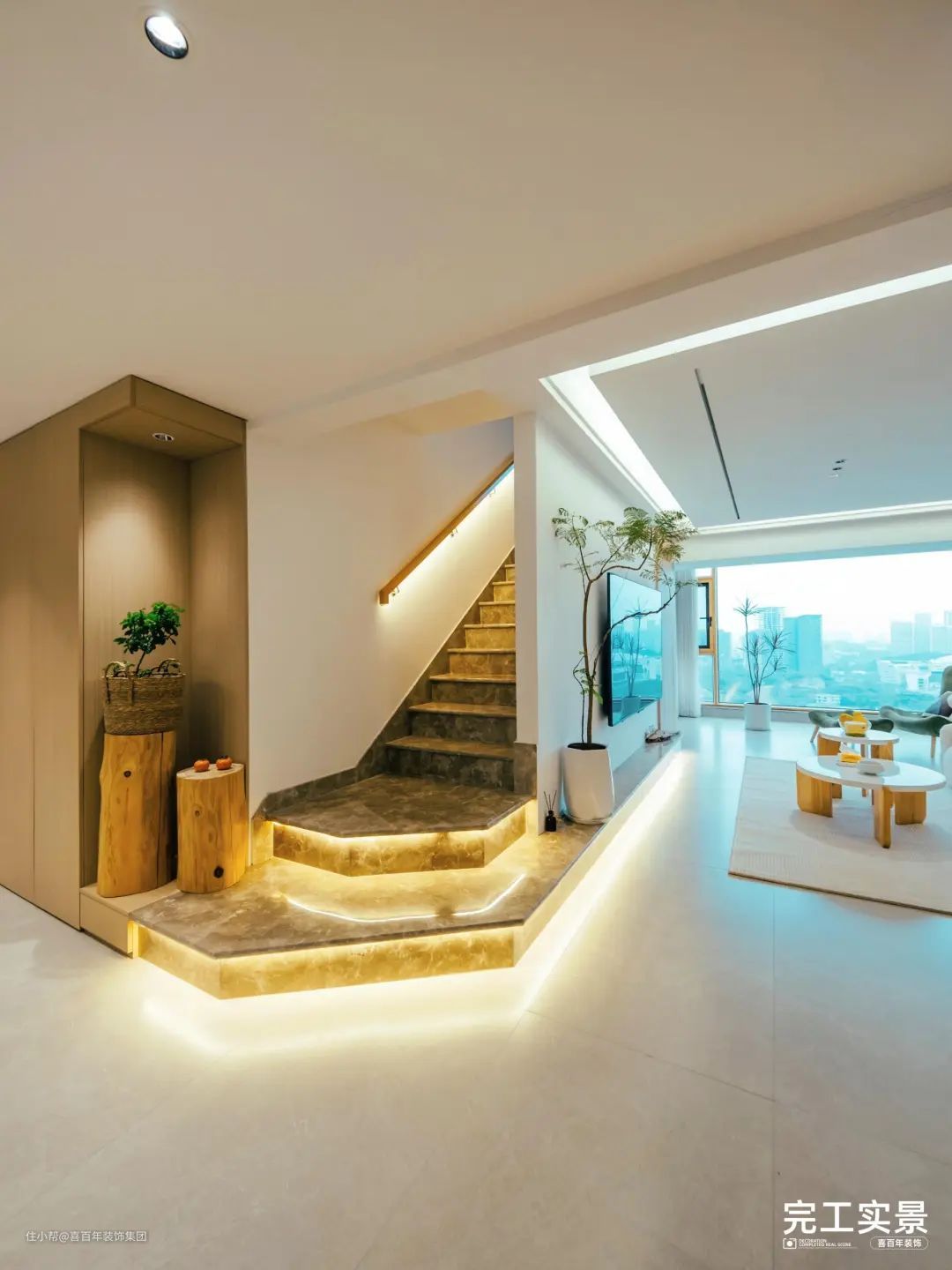 最底层的楼梯延伸做地台,围出绿植景观,实现一步一景,为楼梯区注入生命力和绿意。