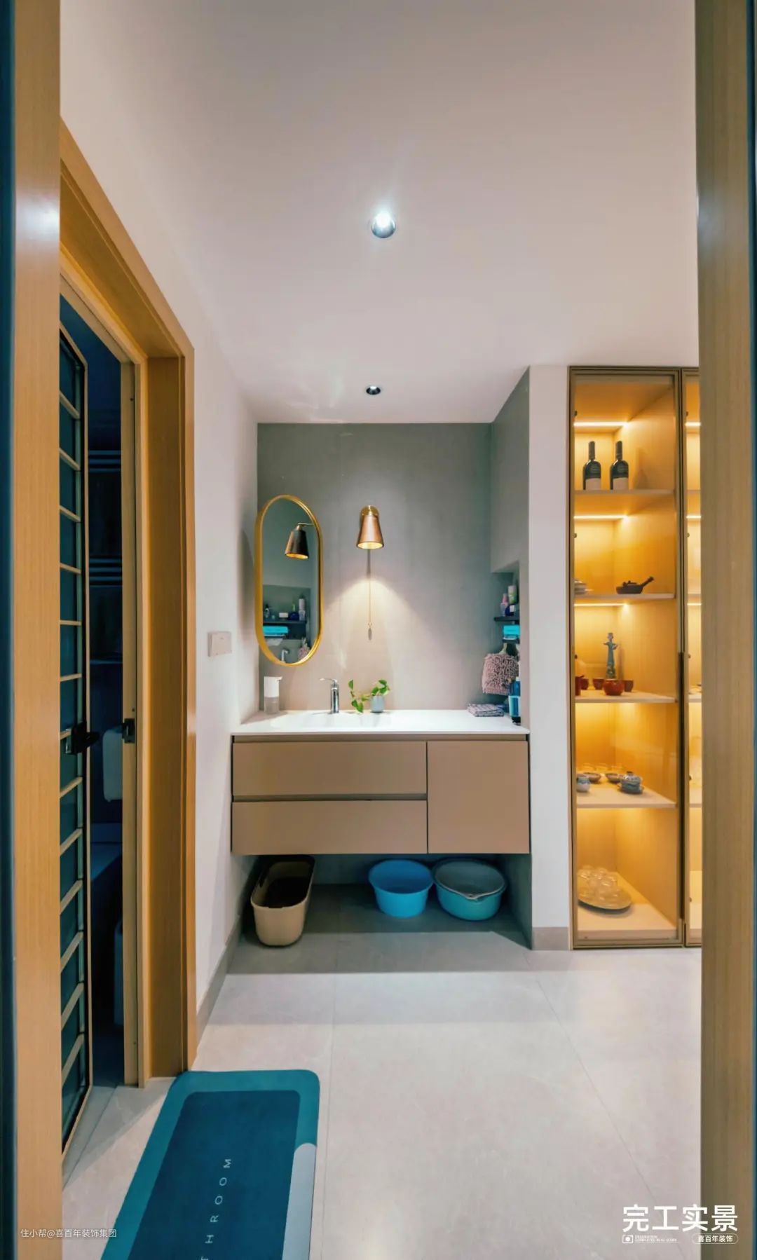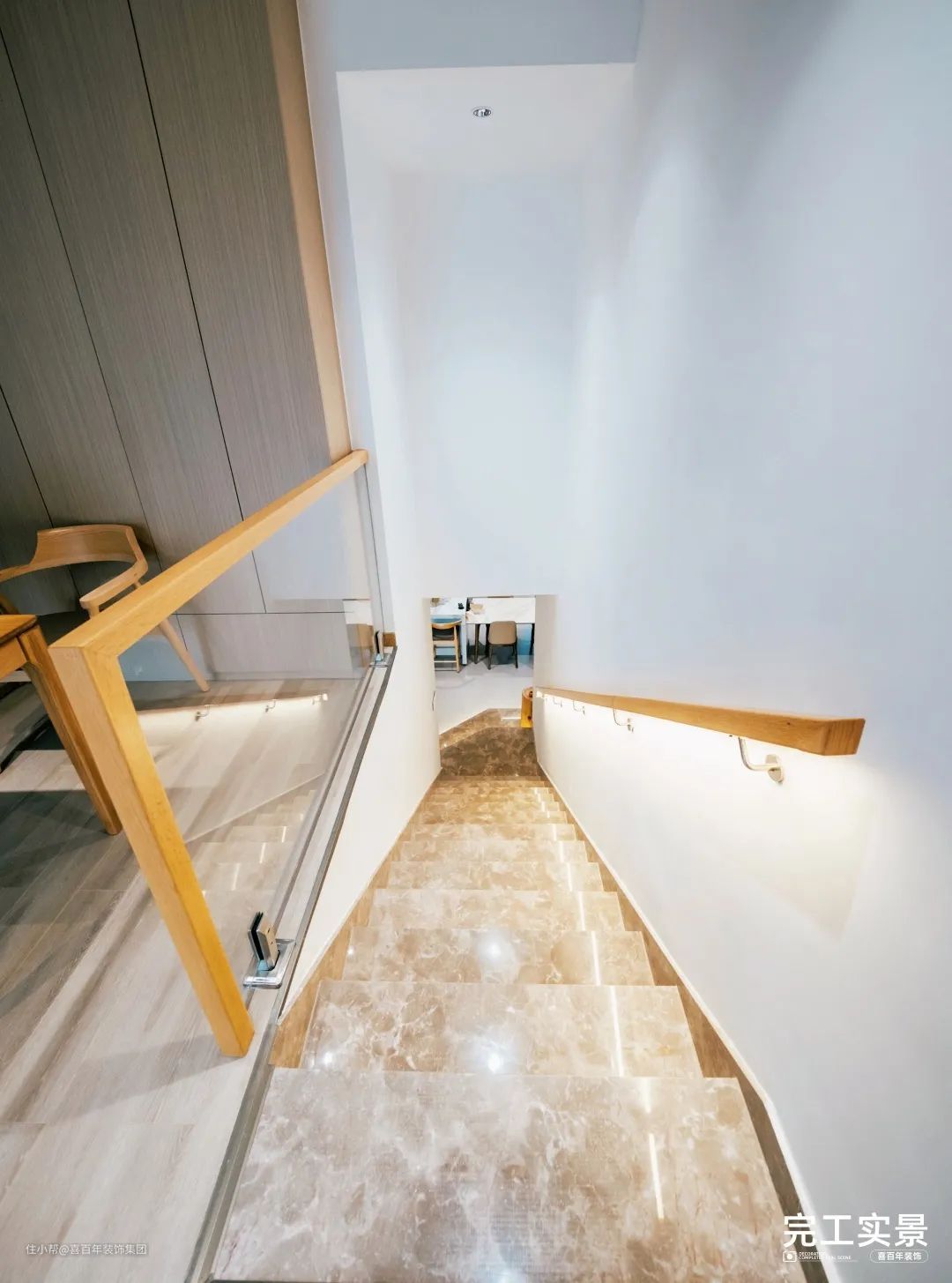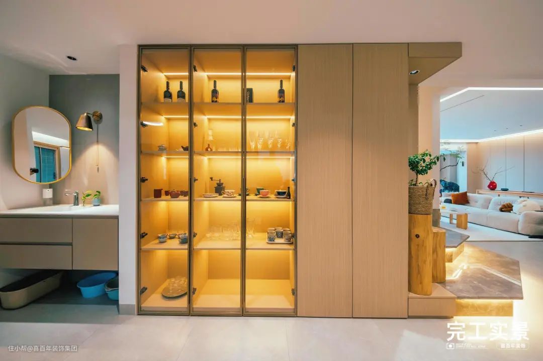 通往二楼的转角是一面通顶储物柜,可容纳日常物品,带有透明玻璃门柜,可以摆放红酒、装饰品,突出轻奢感。