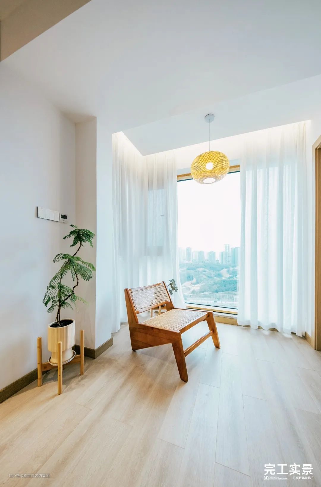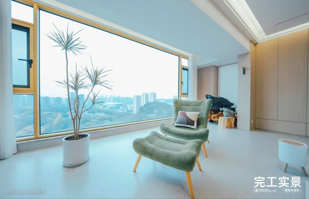 超大的落地窗与外界交流互,让清风和阳光充分进入家里。并且在阳台处放置一把单椅和绿植,平时躺在上面看书和刷手机。