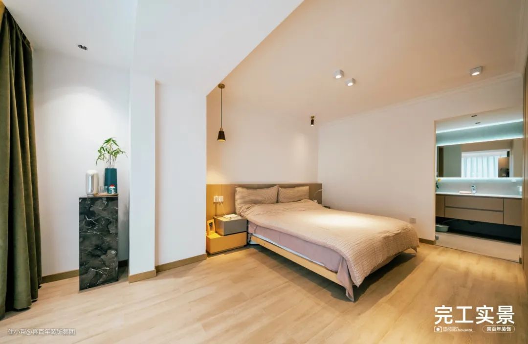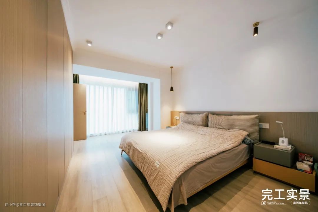 对床一整面墙都是通顶储物柜,满足业主的收纳需求,美观的同时便于打扫卫生。