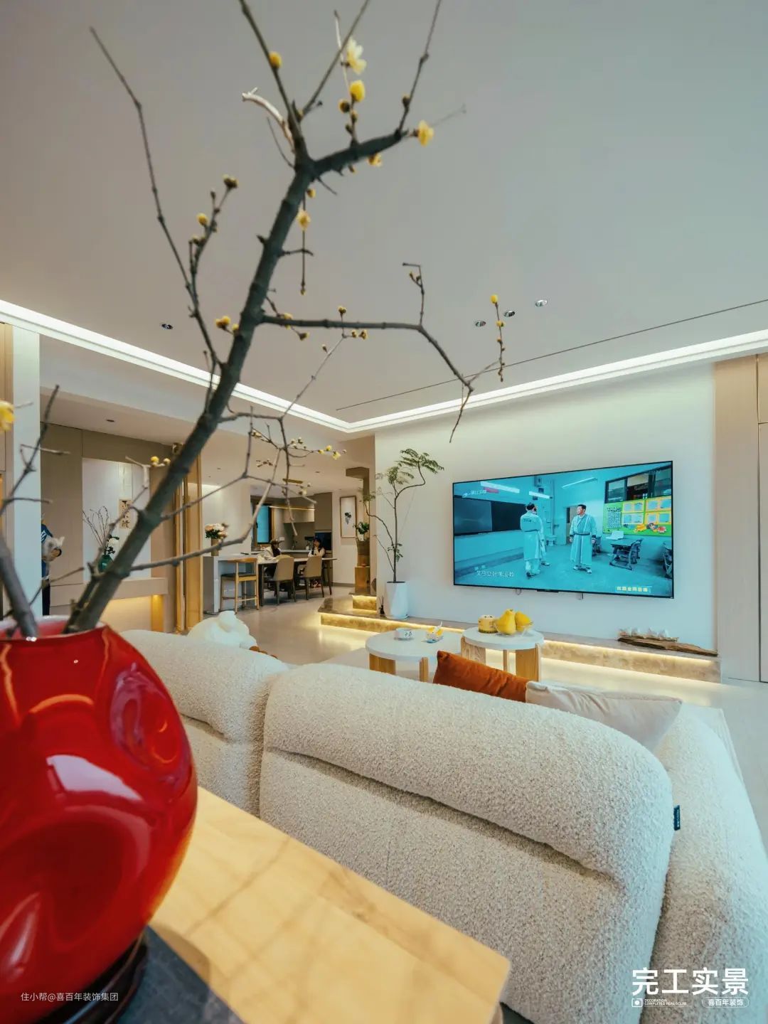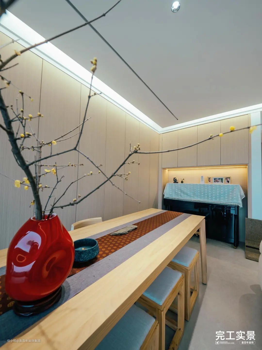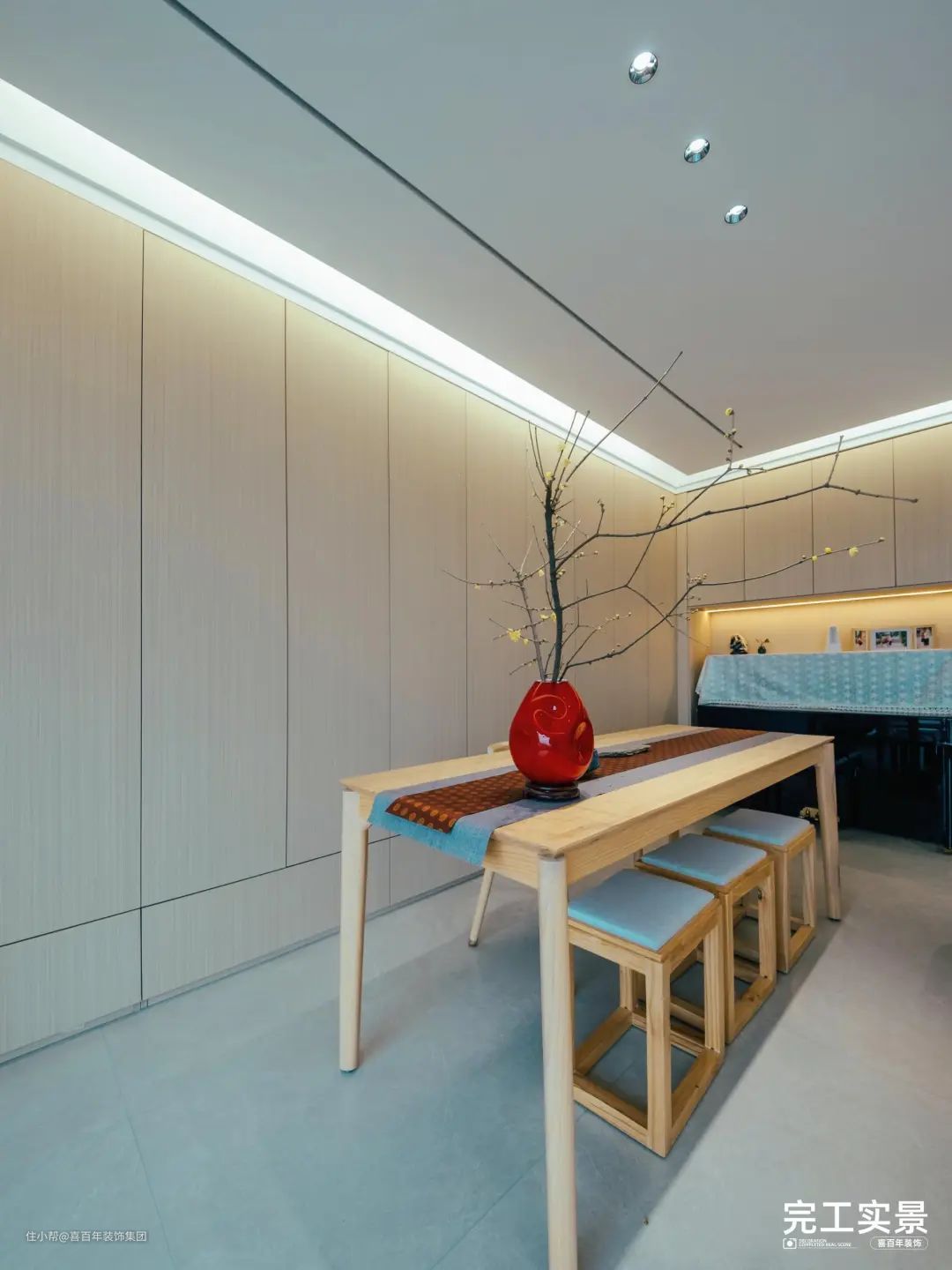 原木会客桌椅放置沙发背后,充分结合绿植点缀,营造出空间的美好与纯粹。在一众奶白+原木色调中,花瓶的一抹红色起到了点缀作用。