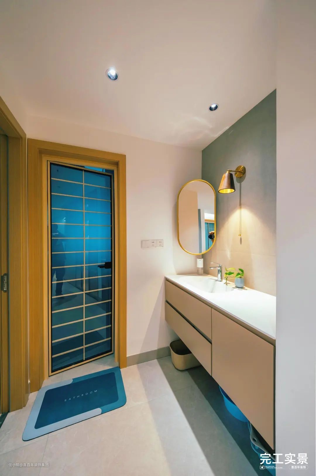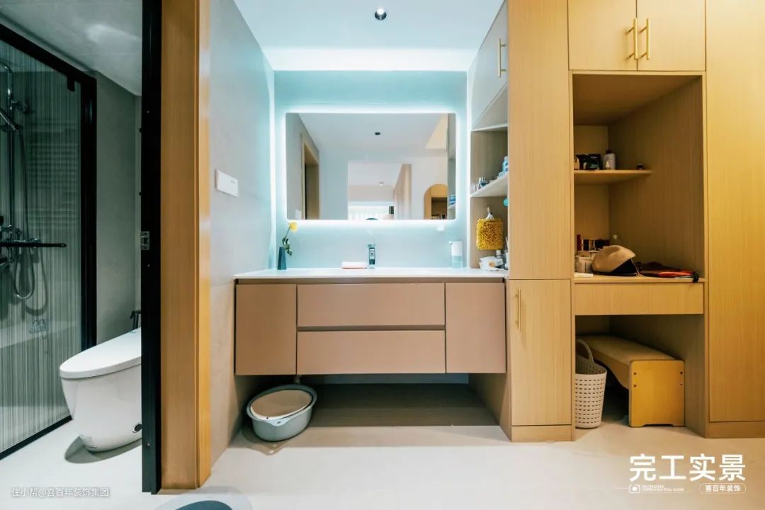 接着是一楼的卫生间,明亮的二分离设计,干区宽敞又整洁,悬空的洗漱台没有卫生死角,大抽屉有充足的收纳空间。