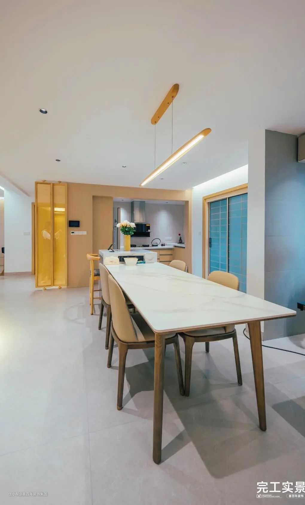 全开放的客餐厅布局,整体色调以浅色和奶油色为主,空间通透干净,搭配线性灯,简约的设计感和层次感。