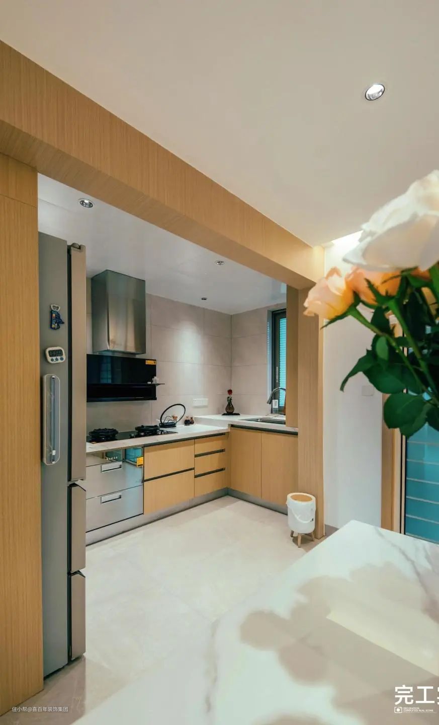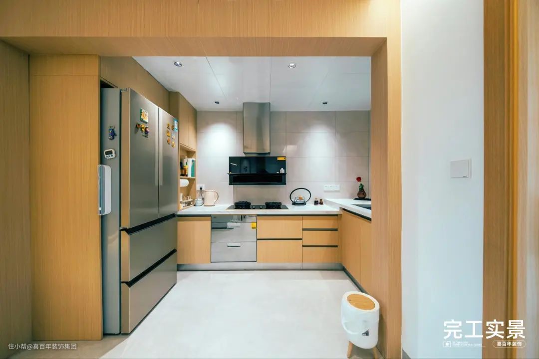 U型橱柜,空间利用率高,洗、备、切、炒区域分明,动线合理。橱柜主要是原木色,柔软治愈,光线充足。