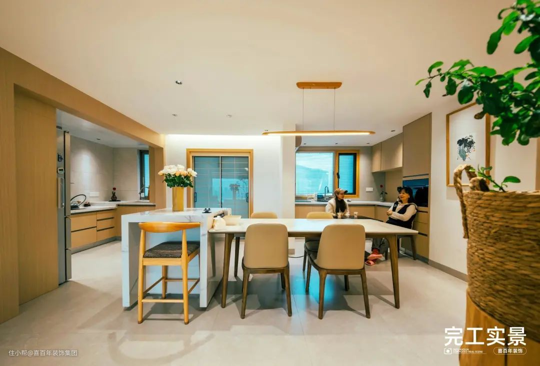 餐厨一体式,餐桌+岛台组合,各区域间去掉过石门,空间感更强。大面积偏暖色调的原木色让空间更治愈,搭配纯白色石英石台面,温馨感更强。