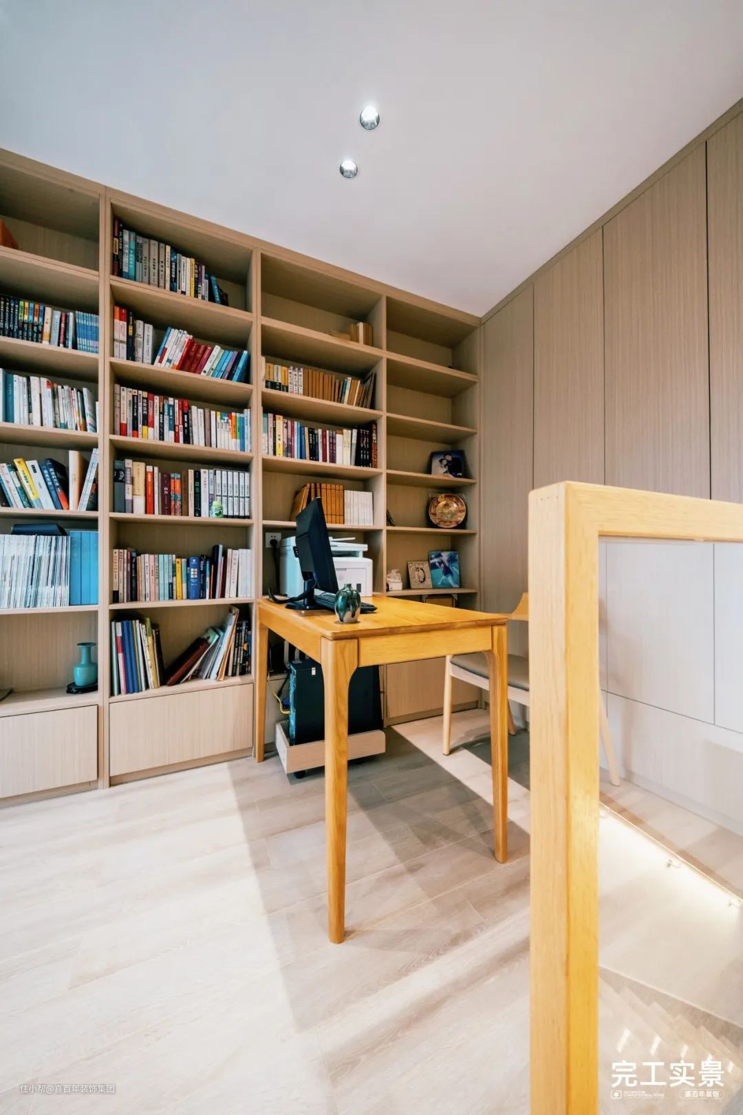 敞亮的开放式书房,平铺木饰面的吊顶+无主灯,L型通顶储物柜,书籍再多也不怕。