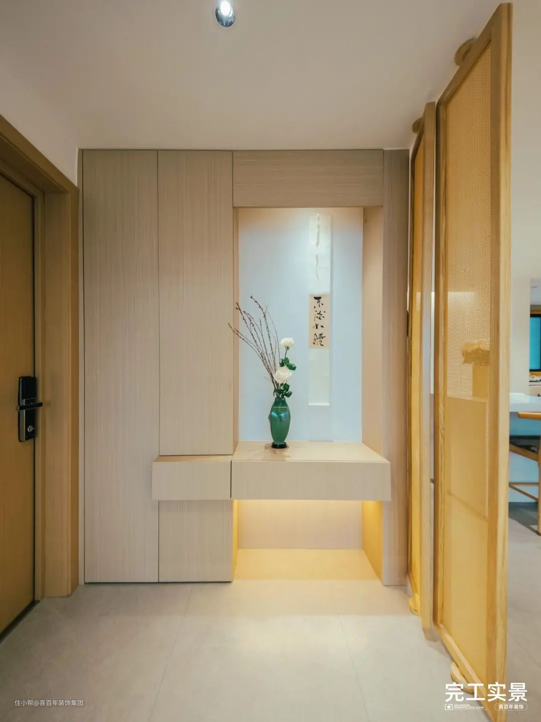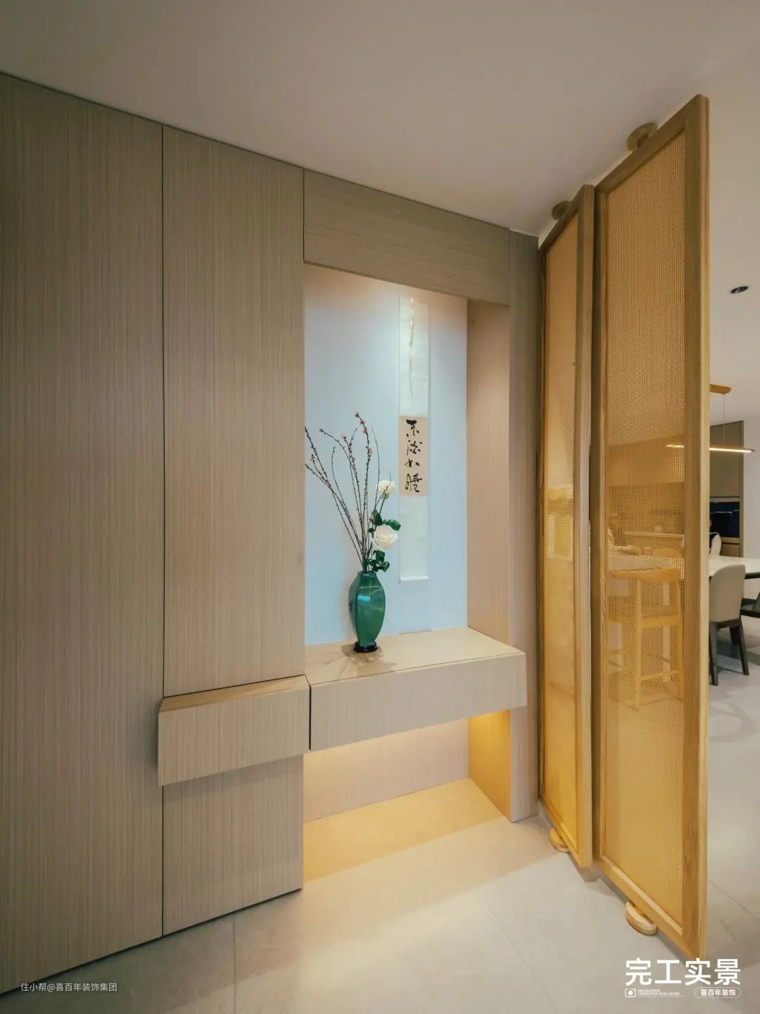 餐厨与玄关之间用木质屏风作为隔断。一通到顶的储物柜,采用悬挂结构形式,放上书签与花瓶,营造古香古色的氛围。