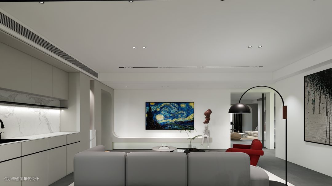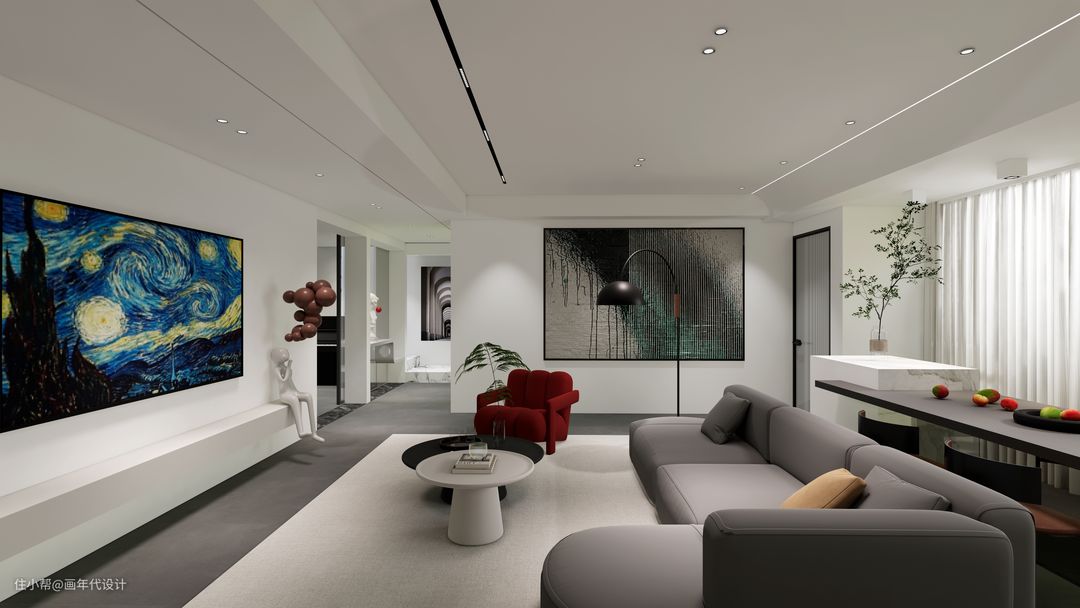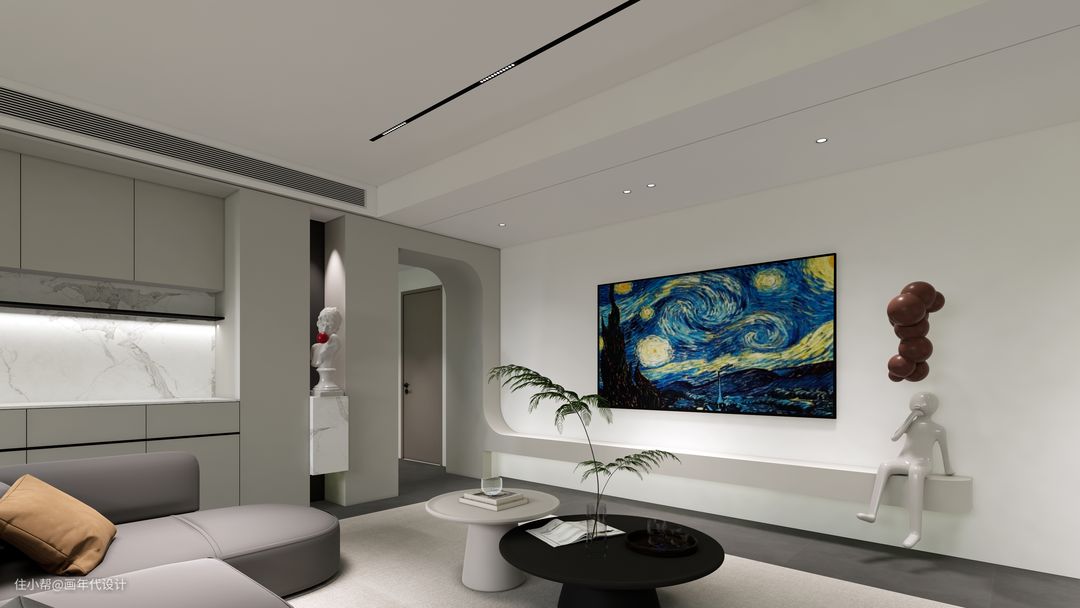 在室内的风格上我们选择大面积留白,宛如展览馆的思想理念,将艺术交给空间,以最纯洁的白色作为底色,把人们的关注点集中在展览出来的艺术品上。而这样的风格真的需要一款自带艺术品气质的电视机,这款创维A7D真是为我们的空间和理念量身定制,它在日常待机状态下,可让空间呈现200+幅世界名画,在不看电视而让电视待机的状态下,配合客厅回字形的动线,在家就能逛艺术馆。
