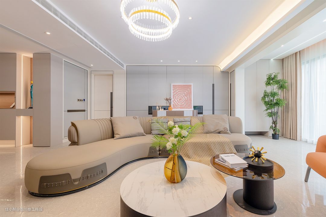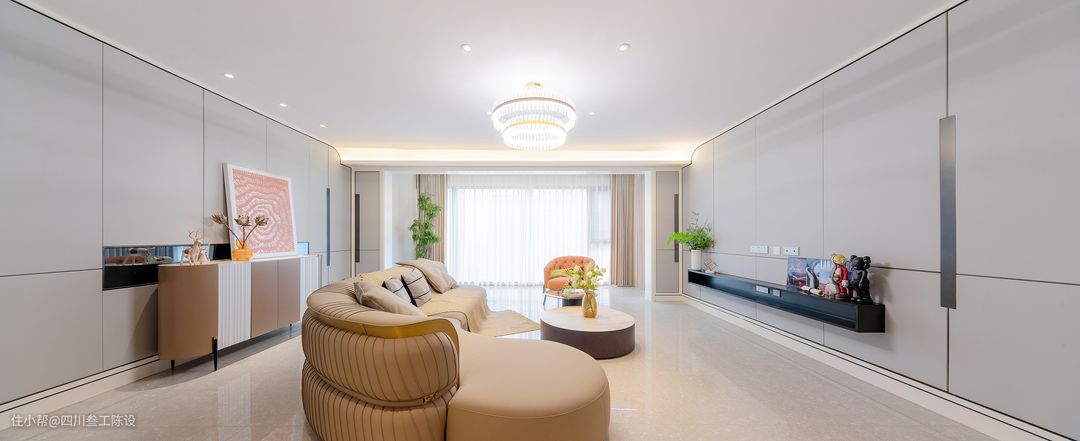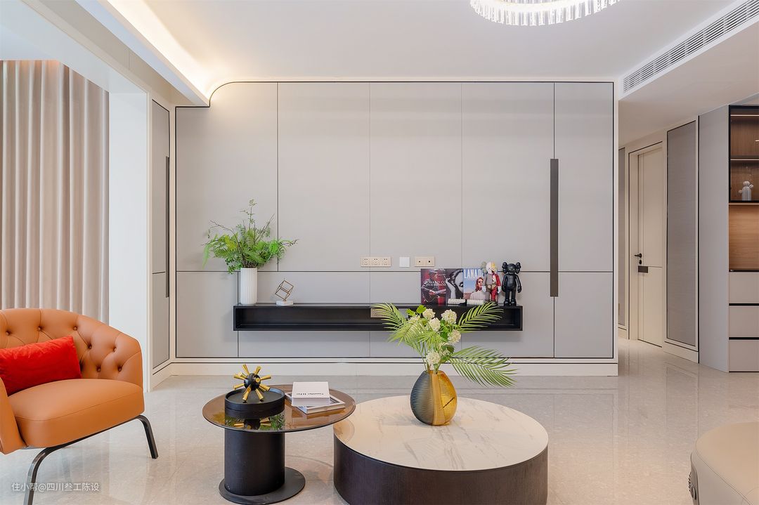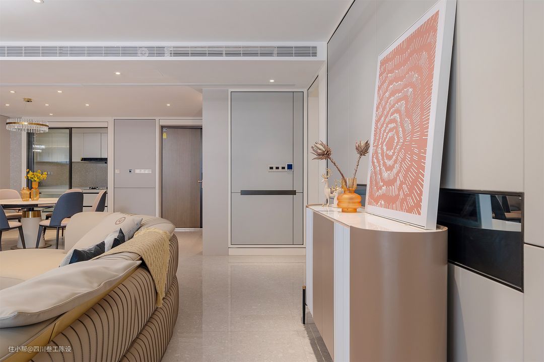 因为客餐分离,因此沙发后面的空间做了其他的妙用,放置一个斗柜,造型独特增加客厅的流畅感,满足收纳,底部留空,方便扫地机器人出入,卫生无死角。