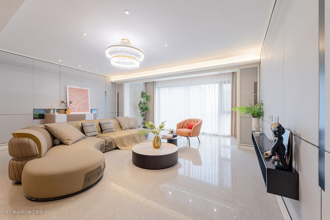 地面使用白色亮面砖通铺,自带的光泽感在灯光与自然光的照耀下显得客厅更加通透明亮,视觉上也让客厅显得更加宽敞,方便清洁不复杂。