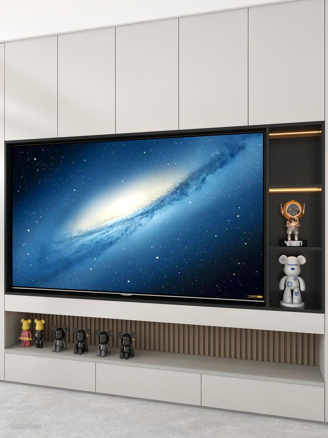 既能让客厅看上去清爽不显杂乱,而且还比较容易做卫生,所以就选择了这款满墙柜体,电视柜分为了有三个不同功能部分,再做一些不同材料的点缀与空间的划分,实用又有颜值的效果就出来了。
