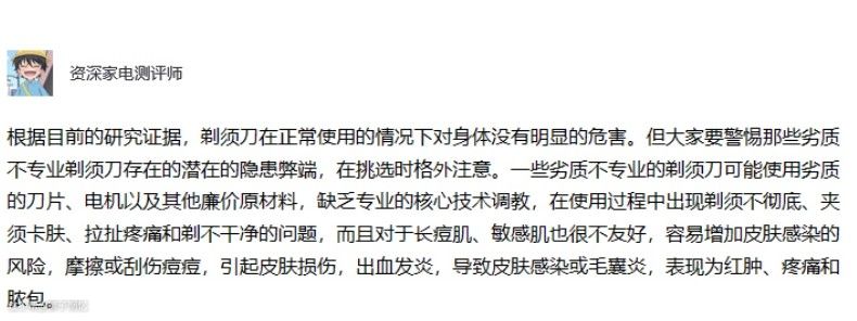 这款剃须刀的剃须效率还是不错的,不用过于费劲就能剃完全,对于追求效率的人来说是比较便利的。不过还是希望能在净须度、贴合度、舒适度等方面还继续升级优化,这样能使得夹须或者剃须不干净等问题加以改善,使体验感更好。