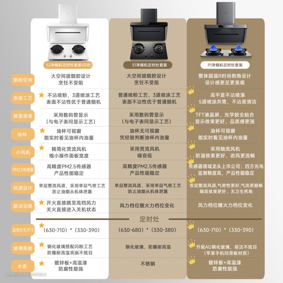 米家净烟机目前主推的型号有三款(P1,S1,S2,)分别对应高端旗舰款,超高性价比款以及高颜值款。三款在技术上都是采用动态微粒捕集技术,净烟除味效果都有保障,而在外观和配置上会有细微差别。
