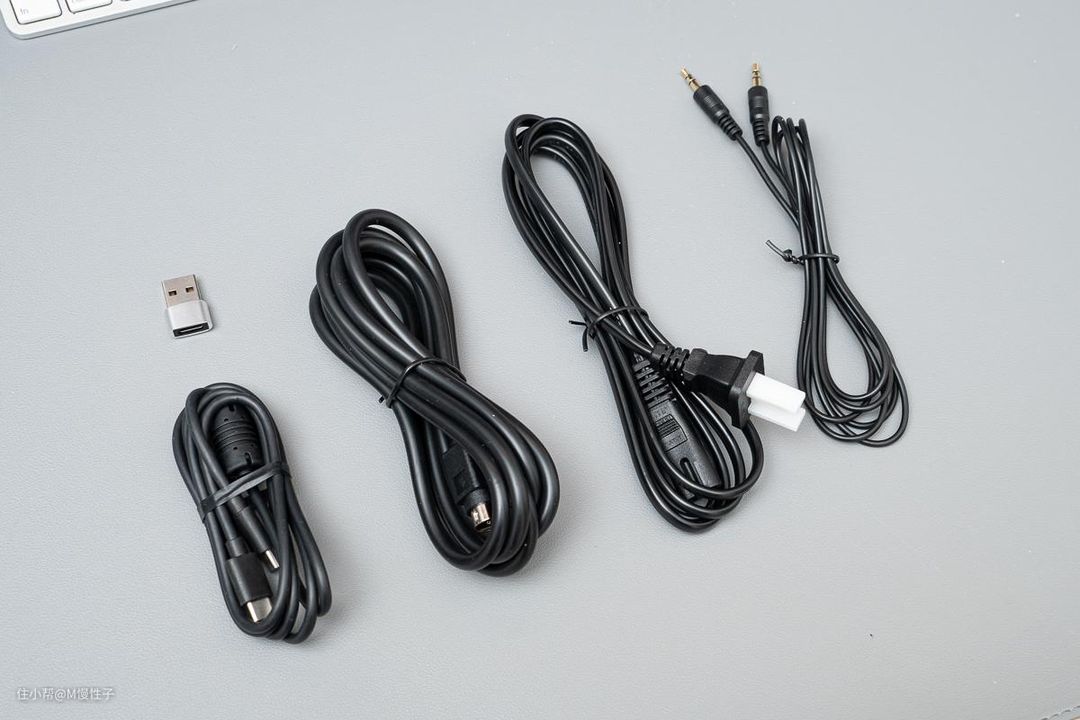 音箱配备了电源线、AUX音频线、音箱连接线和一条可以连接PC端口的TYPE-C线、以及Type-C转USB-A的转接头,方便我们连接各种设备。