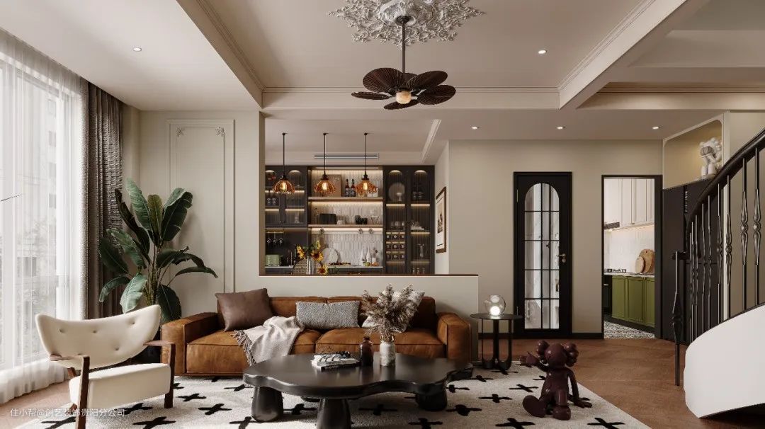 ☷ 本案设计风格定为法式复古风,追求简约的同时还要不失复古中的典雅韵味的空间感受,以白色为基调,辅以棕色、黑色和绿色增添空间色彩视觉,配以复古与现代元素,旨在营造出一个既时尚又充满故事感的舒适空间。