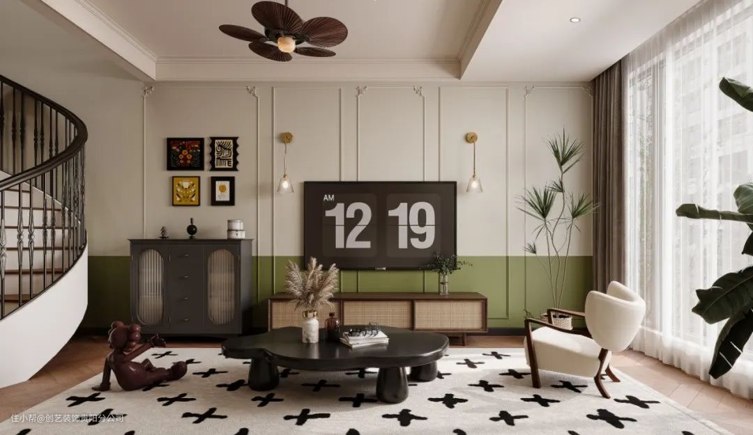 客厅在色彩搭配上,主要选用白色、黑色、棕色为基础配色,硬装大量运用简约几何线条做电视背景墙,绿色刷半墙和绿植营造大自然春意盎然,复古壁灯、斗柜增加复古感,黑色圆形咖啡桌和白色单人沙发椅的搭配,形成了强烈的色彩对比,同时也突出了空间的现代感。墙上的装饰画和地毯上的黑色十字图案,则进一步丰富了空间的色彩层次。