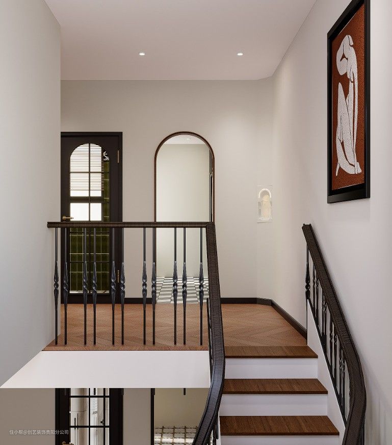 楼梯充满了历史的韵味与现代的魅力,旋转走向,木材质扶手呈现出深邃而温暖的色调,仿佛在诉说着岁月的故事,墙壁上挂着的一幅画是整个楼梯间的点睛之笔,给空间增添了多一分文化底蕴,充满了温馨而舒适的感觉。