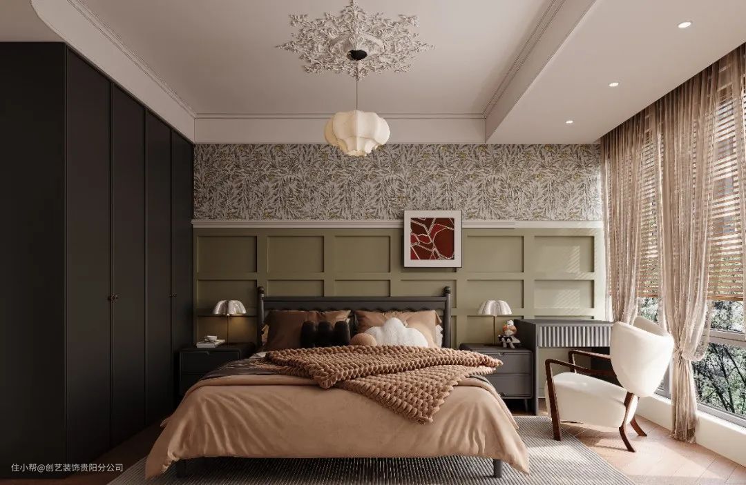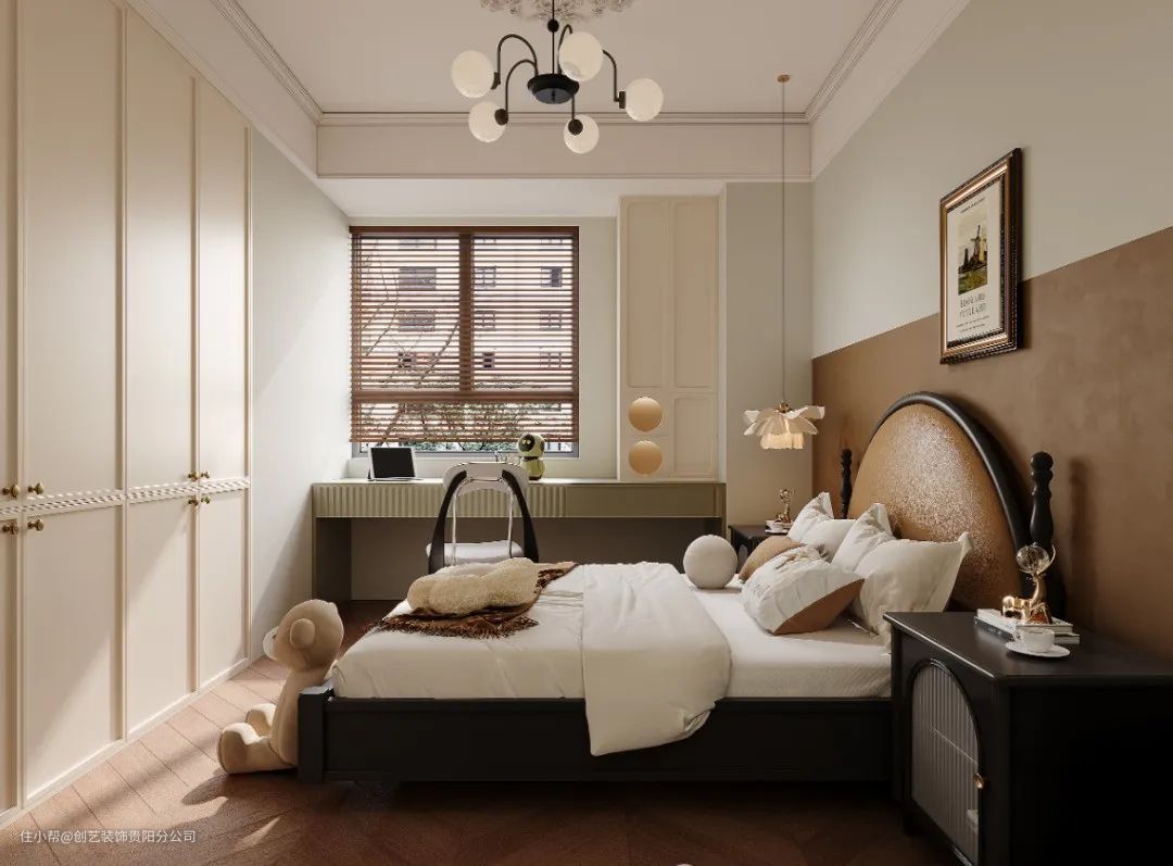 与客厅的柔美雅致呼应,次卧选用棕色刷漆半墙,与木地板形成呼应,复古灯具,墙壁装饰画和复古吊灯充满复古的异国风情,带给人很强的治愈感。
