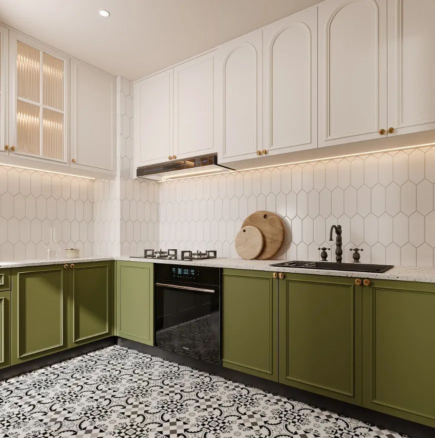 进入厨房,仿佛穿越了时光的隧道,回到了那个充满浪漫与诗意的年代。整体色调以绿色和白色为主,交织出一种清新而典雅的氛围。