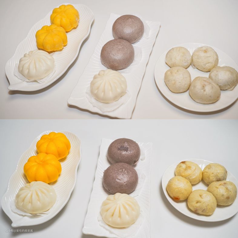 今天早餐的主角是手工奶黄夹心南瓜发糕、广州酒家燕麦黑米包、叉烧包和大希地嵊州鲜肉小笼包,可以说是种类丰富,满足家庭成员的饮食小喜好。