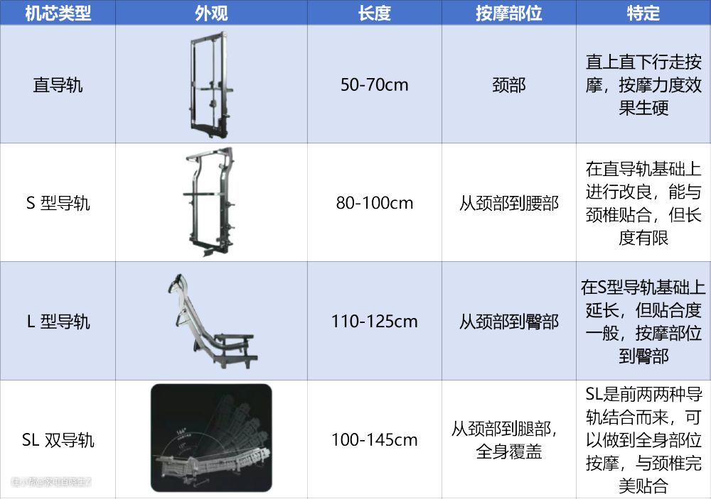 导轨是按摩椅机芯运动的轨道,也是衡量按摩椅档次的标准之一。目前按摩椅导轨主要分为:SL 双导轨>L 型导轨>S 型导轨>直导轨