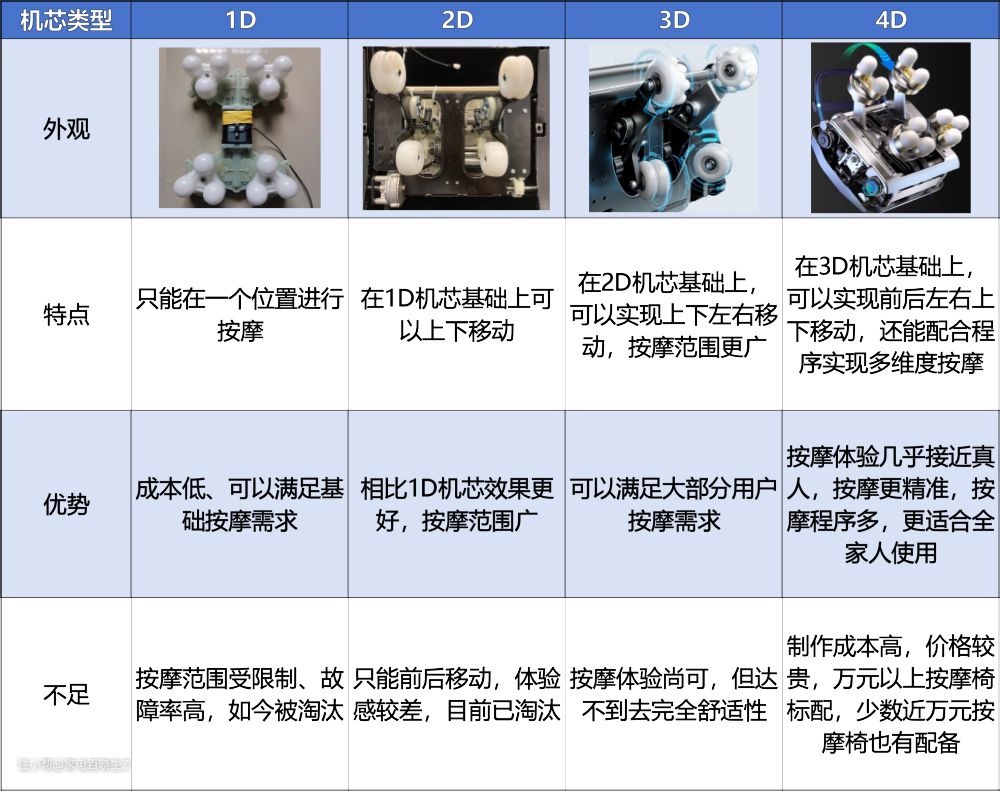 机芯相当于按摩椅的大脑,它控制着按摩头的运动方向和承载按摩头的按摩动作,目前机芯主要分为 1D、2D、3D、4D 机芯,其中常见的是 3D 和 4D 机芯。