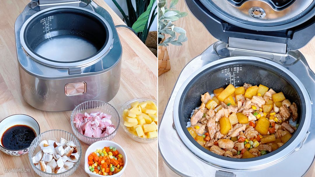 米饭的水量是正常煮饭的四分之三,在放米之前还可以在内胆上抹一层油,然后选择煲仔饭功能,等待大约25分钟,它会提示你加入食材,把炒香的食材均匀铺在米饭面上,这时候可以沿米饭边缘倒入一些食用油,然后继续烹饪。
