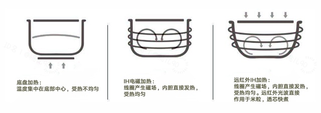 目前市面上的电饭煲主流的加热方式有底盘加热和IH电磁加热。还有一种比较领先的远红外穿透加热技术。
