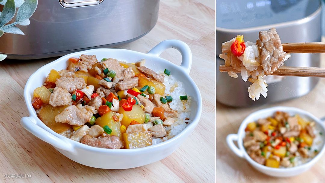 再耐心等待一会儿,土豆五花肉煲仔饭就做好啦!食谱上没有说加辣椒,但是重庆人怎能不吃辣,撒上葱花小米辣,一个字,真香!