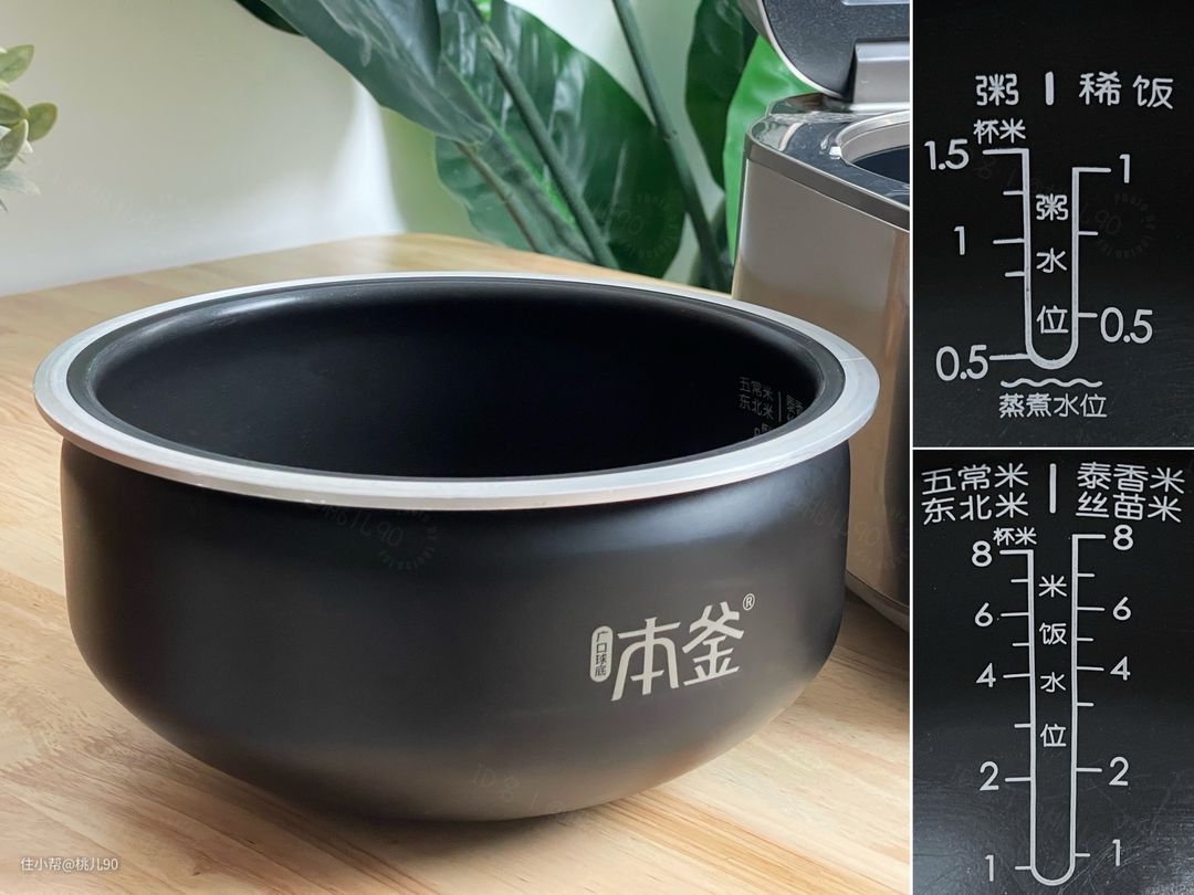 广口球底本釜2.0内胆看上去厚实稳重,很有质感,内侧标明了各种米类在煮饭和煮粥时需要的米、水刻度量。8层复合材料,耐用,不粘锅。
