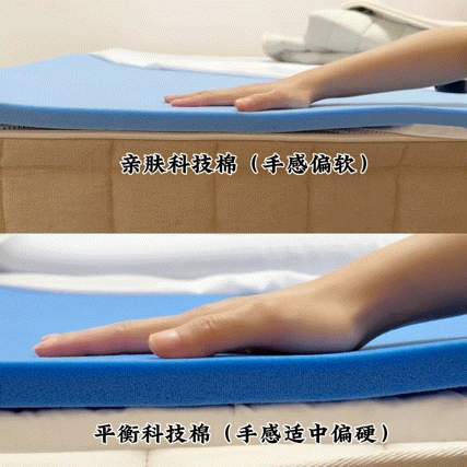 通过按压,可以看到两个垫层软硬度是不同的,亲肤科技棉属于偏软的睡感,能明显感受到包裹感,相反平衡科技棉,则属于偏硬适中的睡感,能为身体提供有效支撑力,对于腰部也能得到足够的支撑。