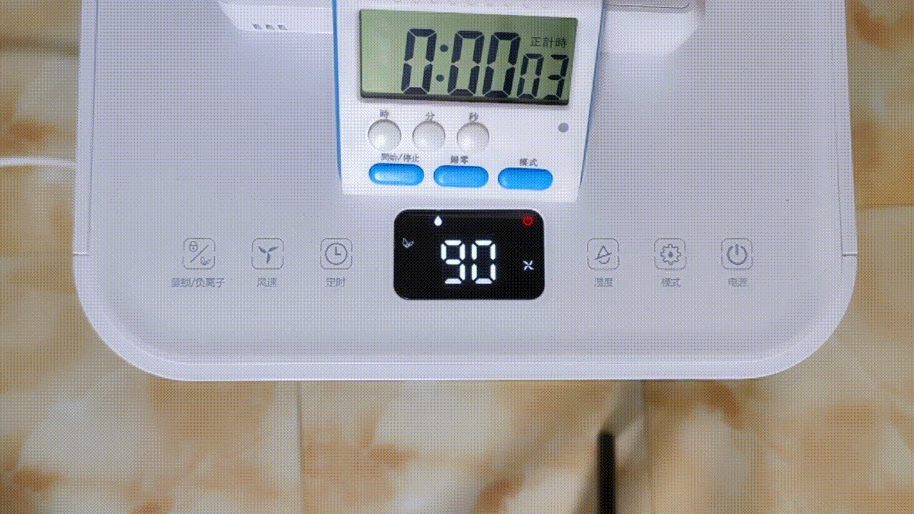 接下来我们在浴室中,利用喷雾器将湿度达到90%,测试一下除湿性能。