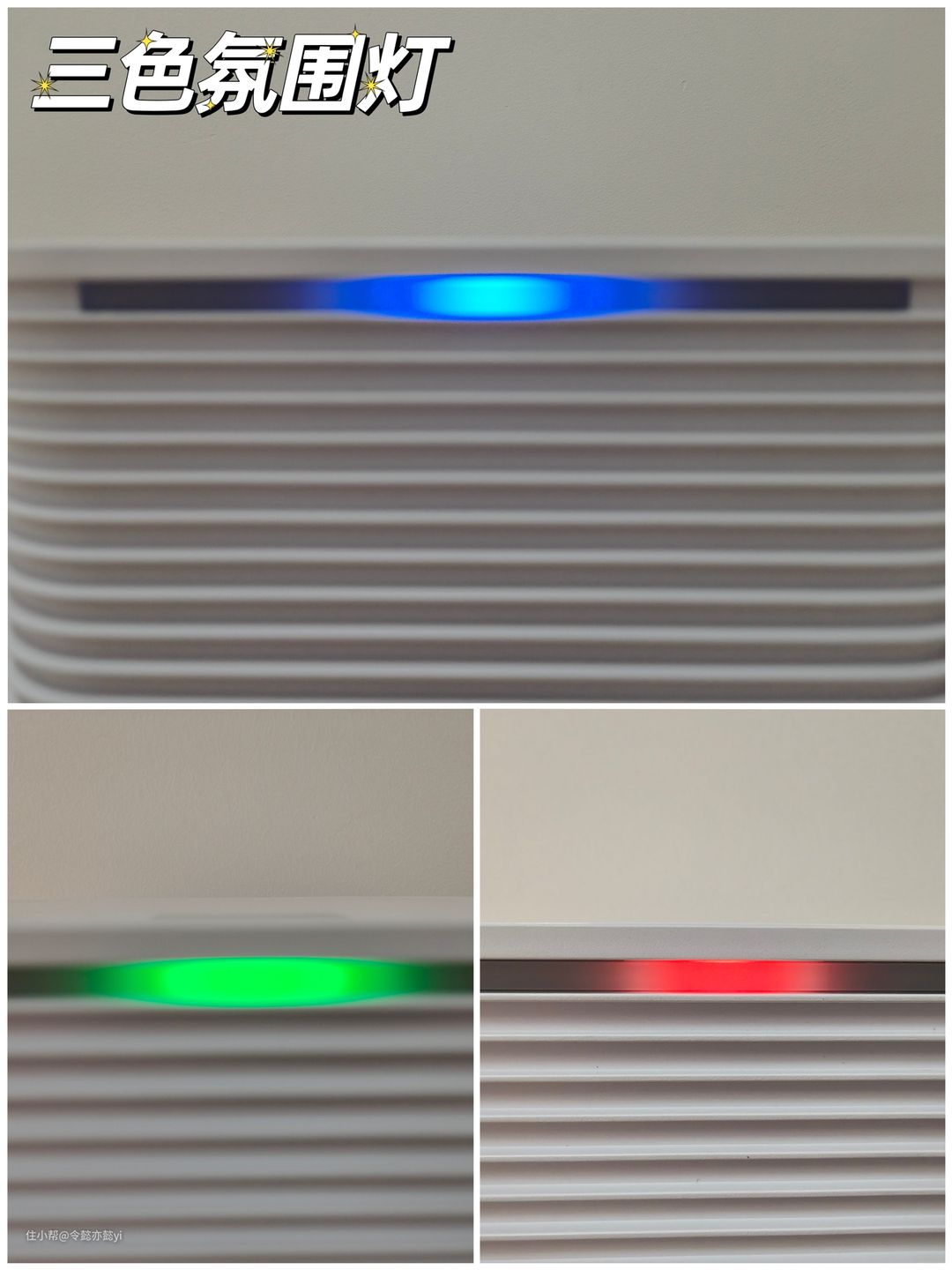 还有个令我非常惊喜的小细节,在小海绵的顶部有一个三色氛围灯,不同的灯色代表了室内不同的湿度范围,便于我们选择何时开始除湿,何时终止除湿。这些在细节上的小巧思,满满体现的都是美的小海绵对客户的悉心关怀。